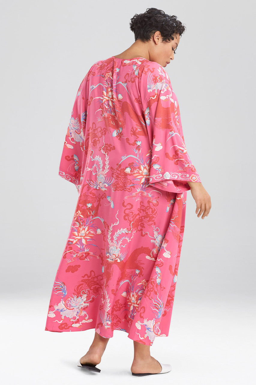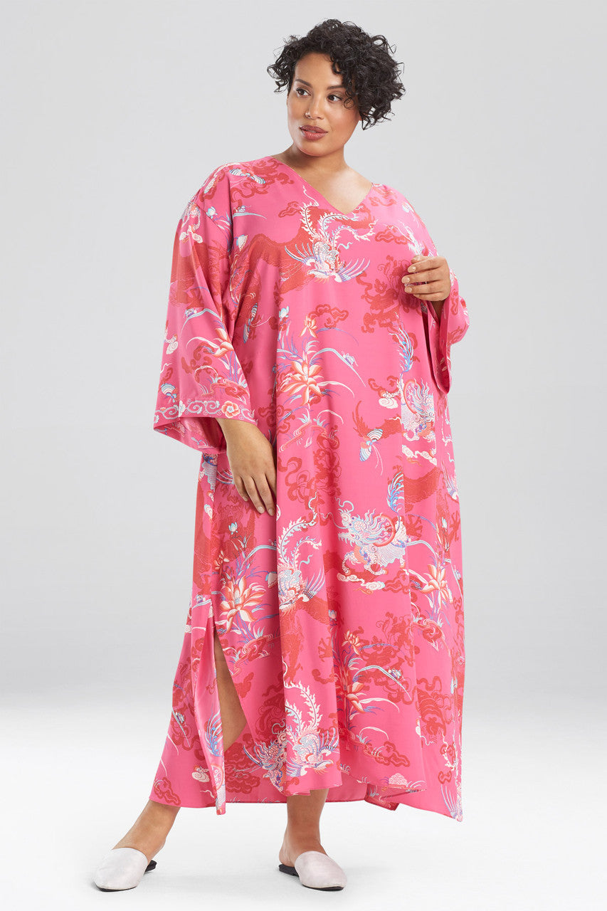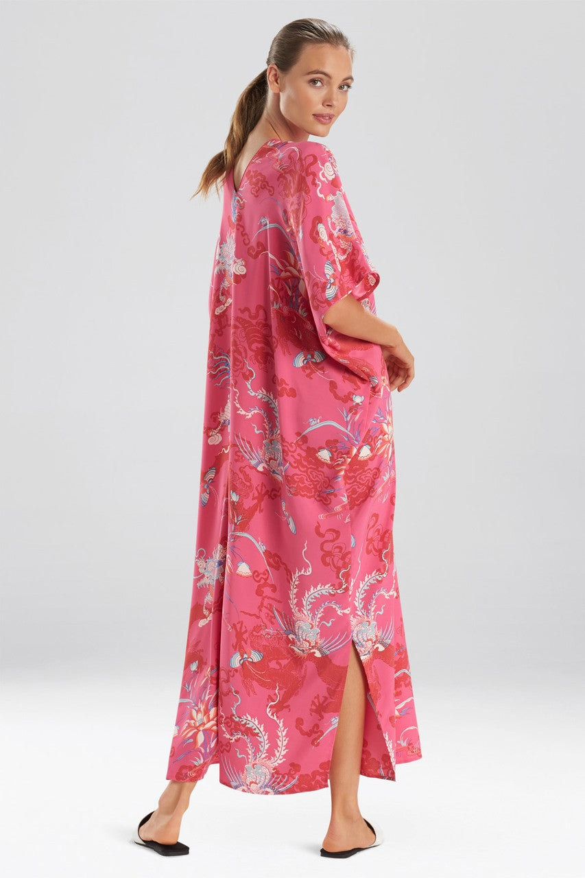 An eclectic spin on a classic caftan with an Asian inspired floral & dragon print.