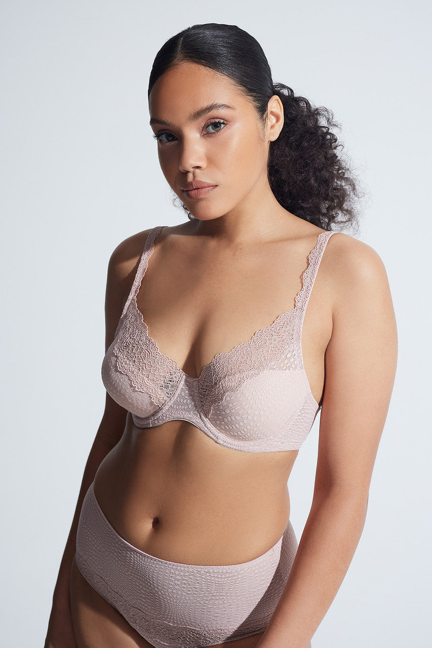 Iconic shape and signature soft feel come together in this new convertible underwire. Innovative moldable lace is paired with scalloped floral lace to offer a romantic look and comfortable feel.
