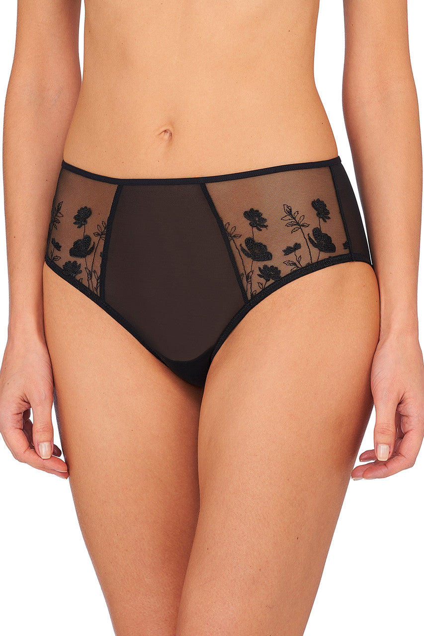 Flat, floral embroidery is paired with breathable stretch mesh for a modern update to a timeless look
