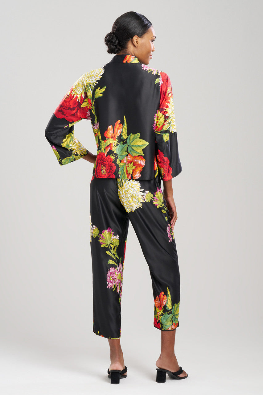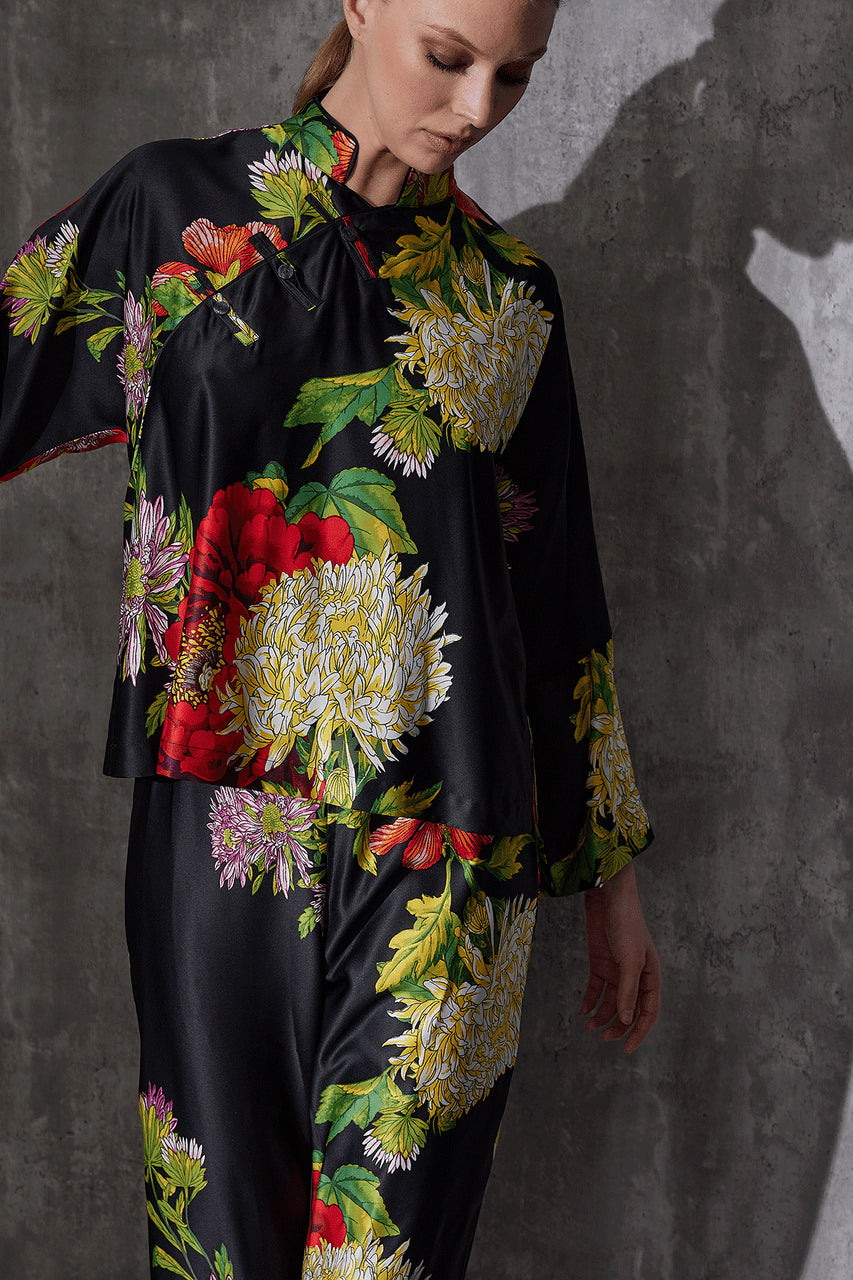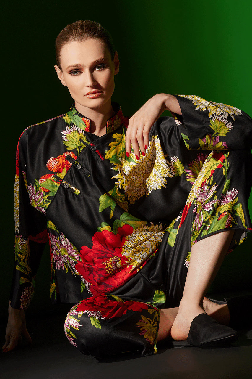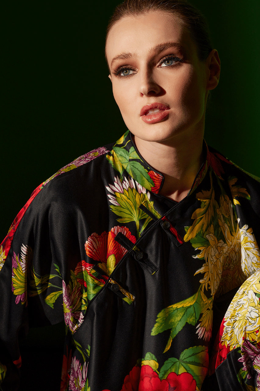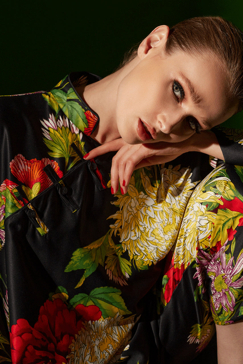 Dramatic florals printed on silky charmeuse.