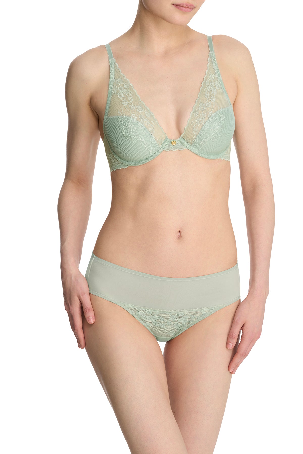 Cherry Blossom inspired lace adorns this contour underwire plunge bra.