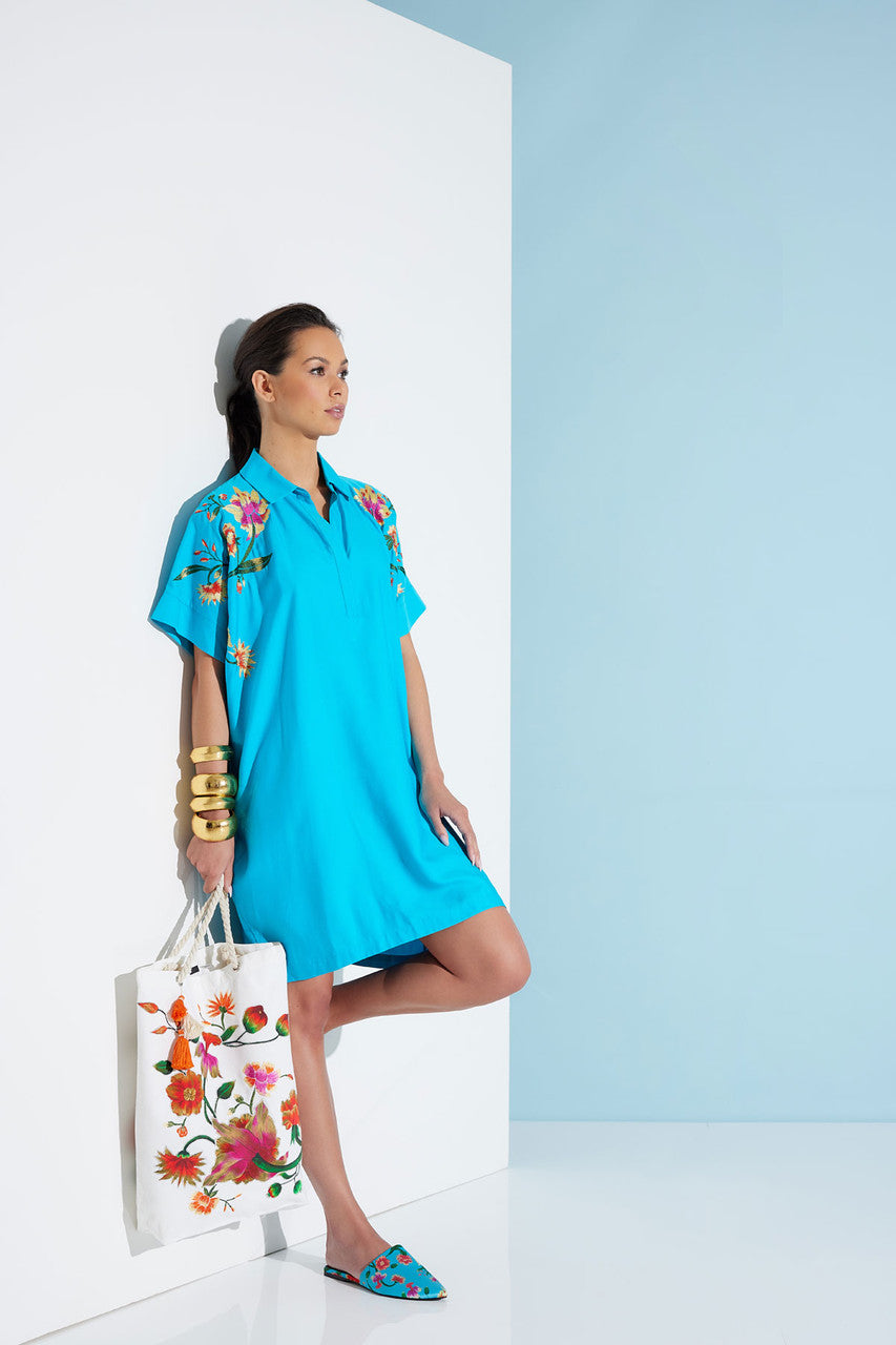 The embroidered Chikayo canvas tote is beach ready.