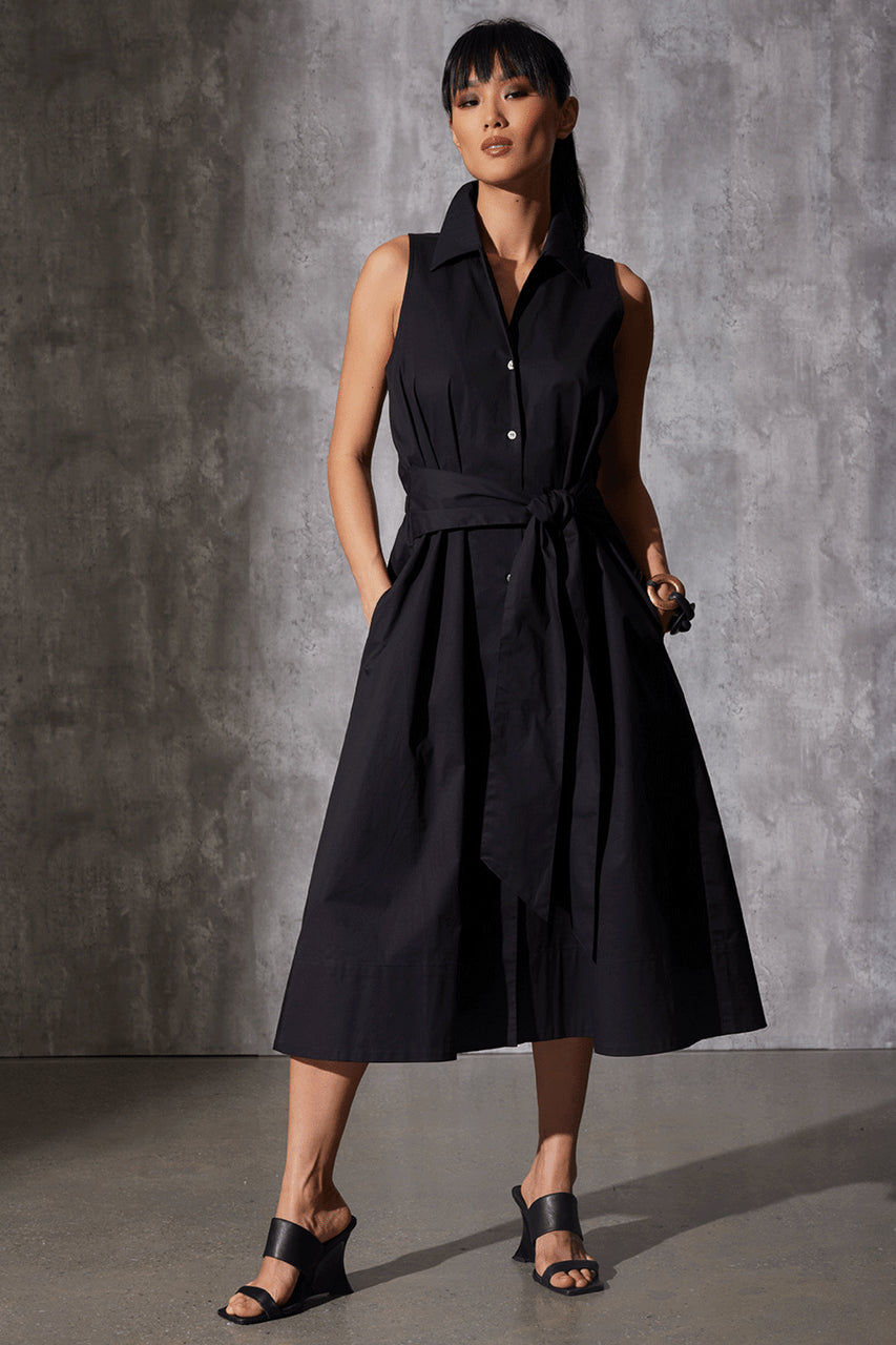 - Button down collared halter shirtdress, 34" self tie belt and pockets at the side seam