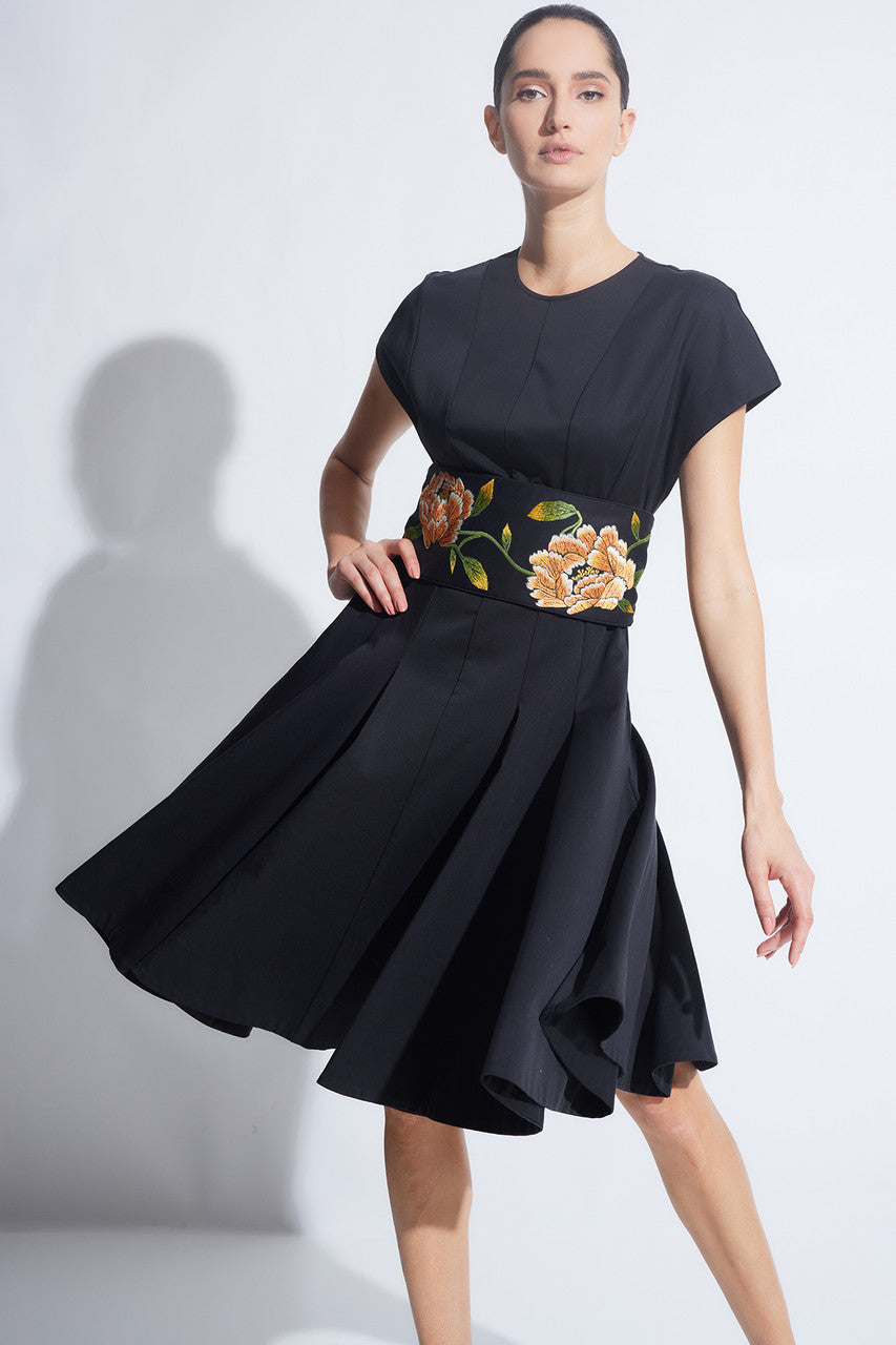 - A dress that accentuates the waist and flares off below the hips, beautiful pleat details for an elevated look