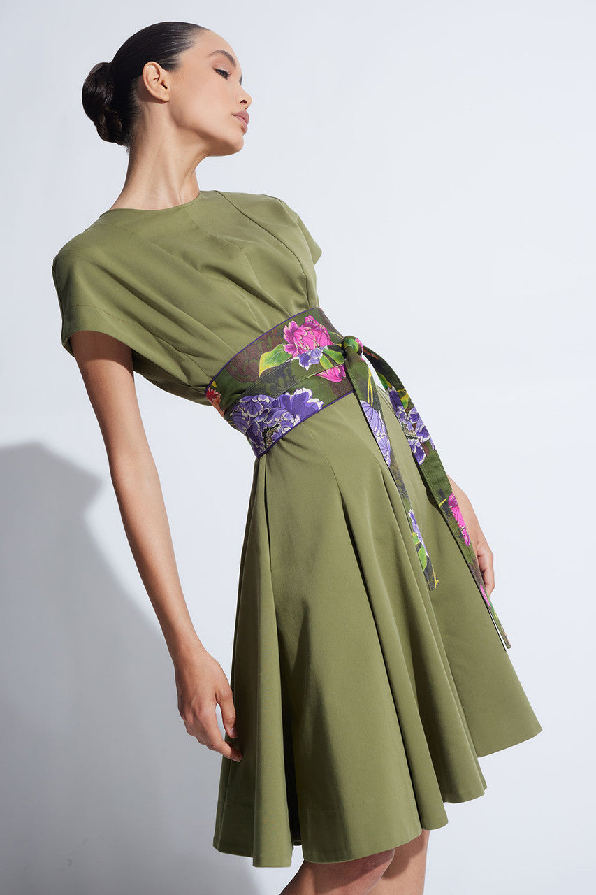 - A dress that accentuates the waist and flares off below the hips, beautiful pleat details for an elevated look