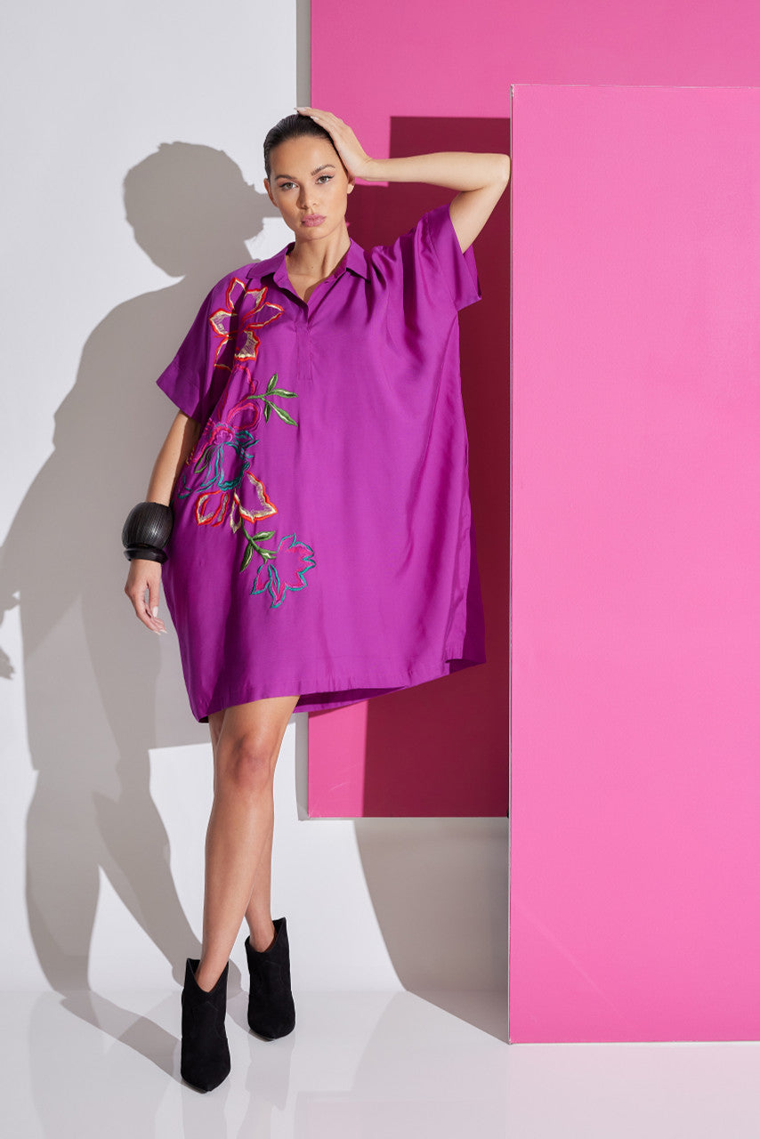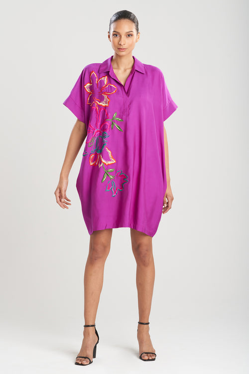 - Knee length, wide cuffed sleeve caftan dress with Natori exclusive embroidery in our soft cotton silk twill