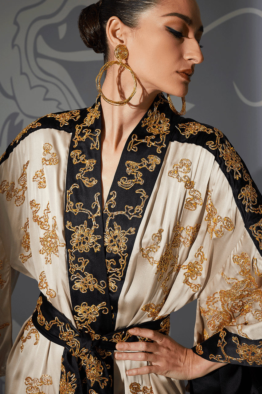 - Long robe with drop sleeves, a self tie belt with tassel detailing, and our iconic "Dragon" motif featured with gold embroidery