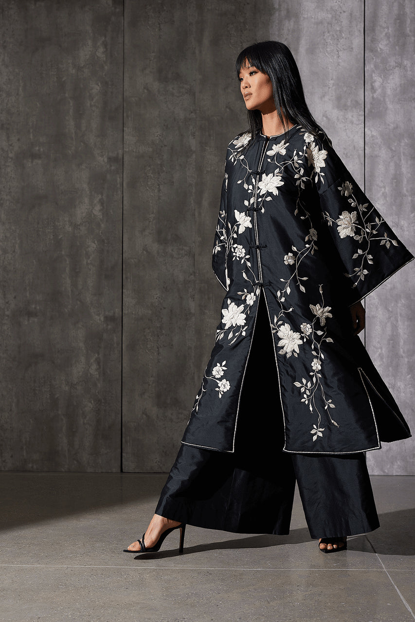 The Josie Natori Fall 2023 Couture collection focuses on curating a wardrobe of collectables, with an emphasis on kimono jackets, coats, and layering pieces. Inspired by the opulence of the Orient Express and Josie’s craftmanship meets comfort mentality.