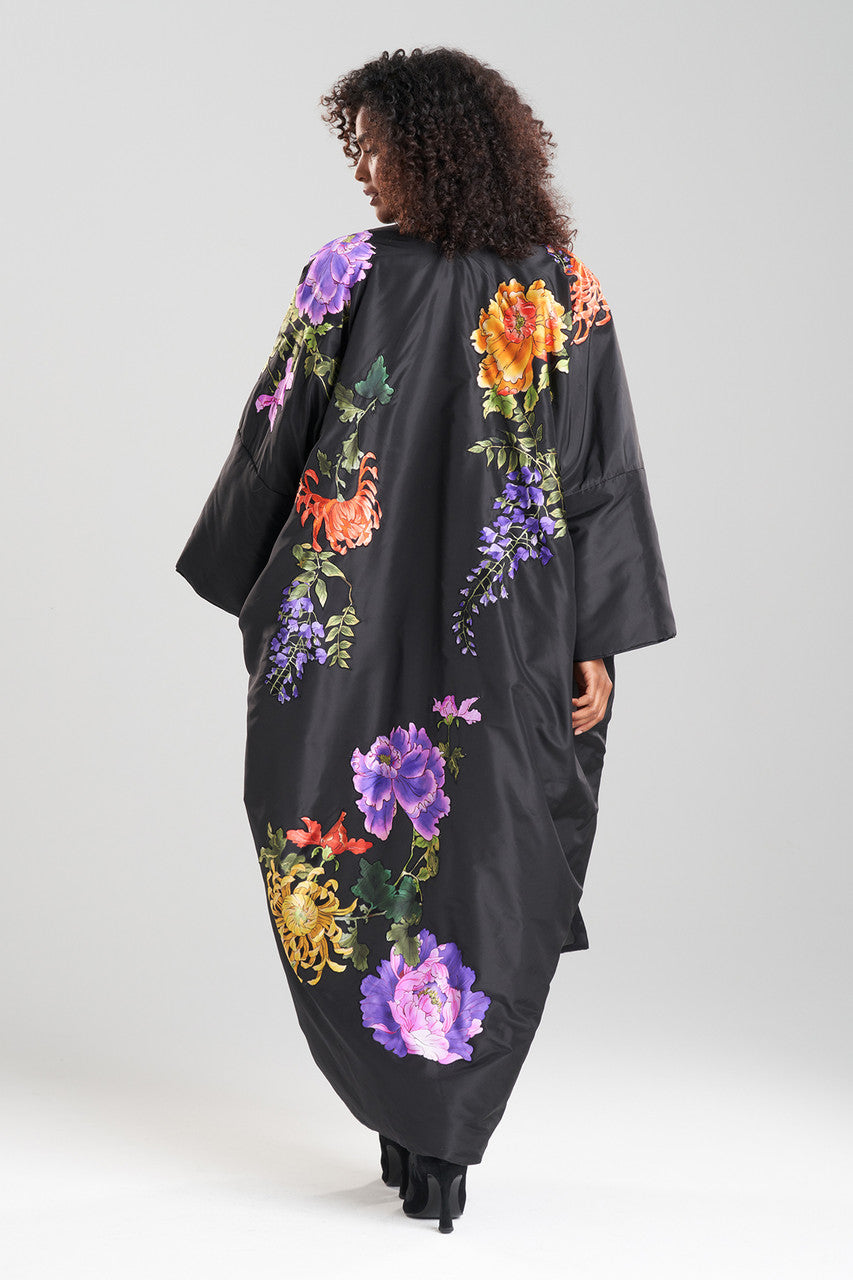 Experience Kairaku Garden. Harmonious florals printed on luxurious silk.