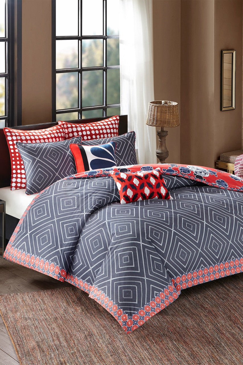 Bold prints and pops of color true to the Josie esthetic. The fully reversible comforter offers two styles in one: over scaled diamond motif and bold florals