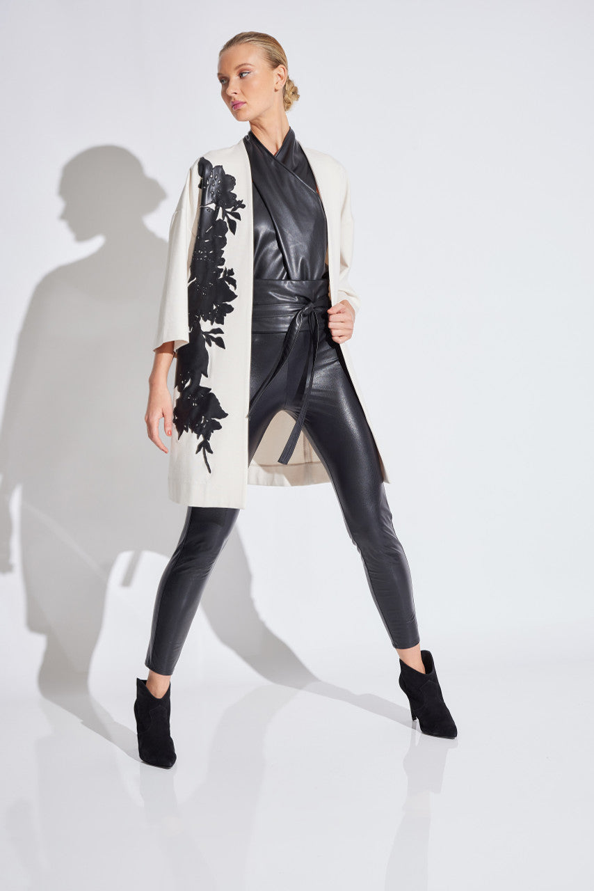 Timeless, fine double knit fabric with 100% vegan leather appliques.