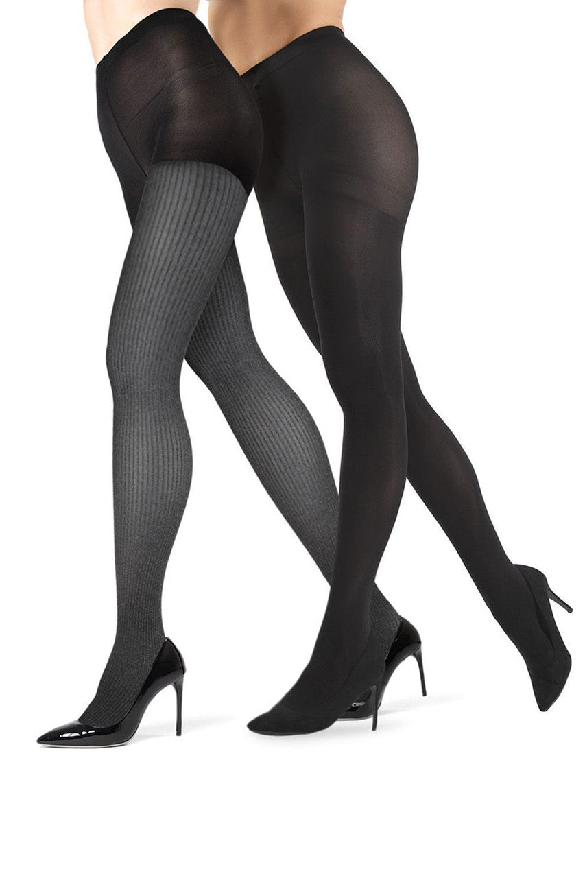 One pair of tights is a dependable solid fabric while the other boasts a fine rib that adds cushion and texture