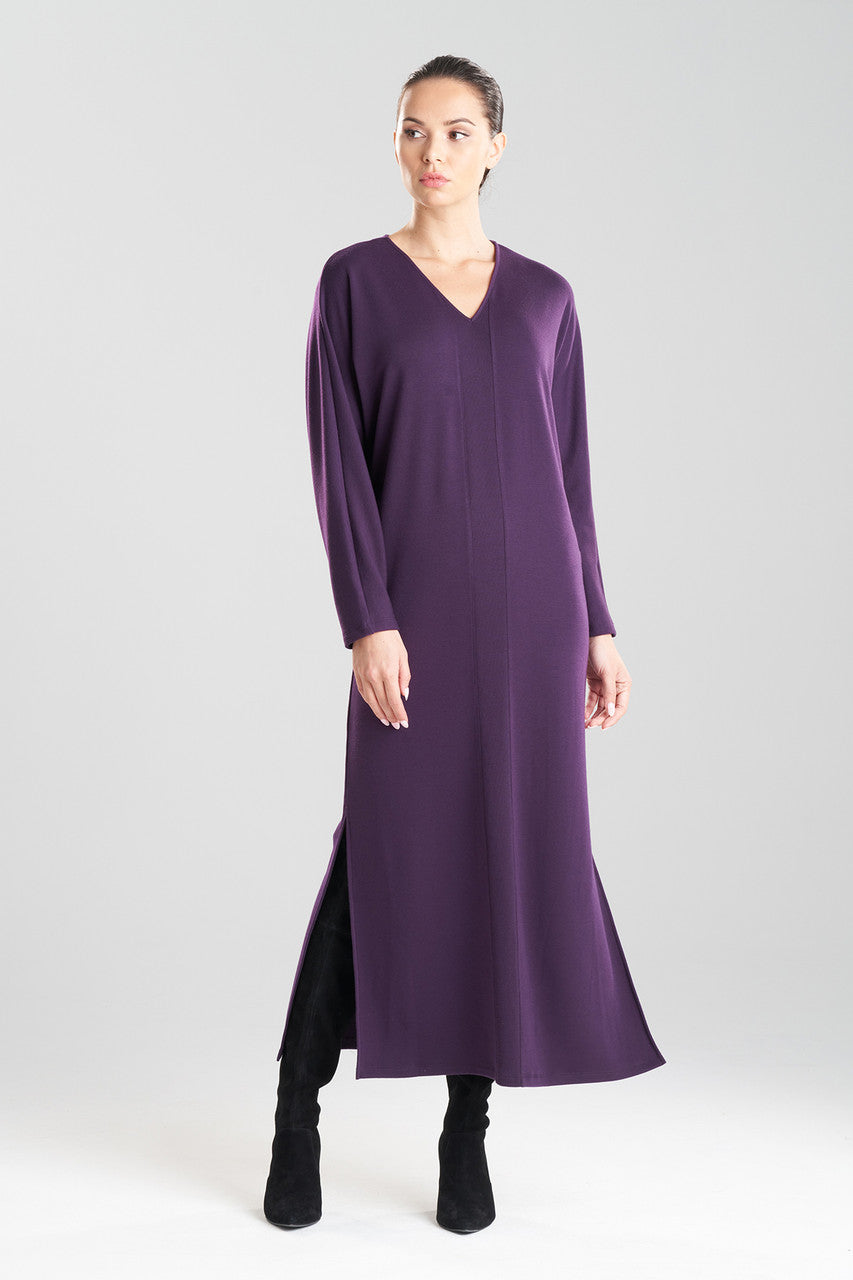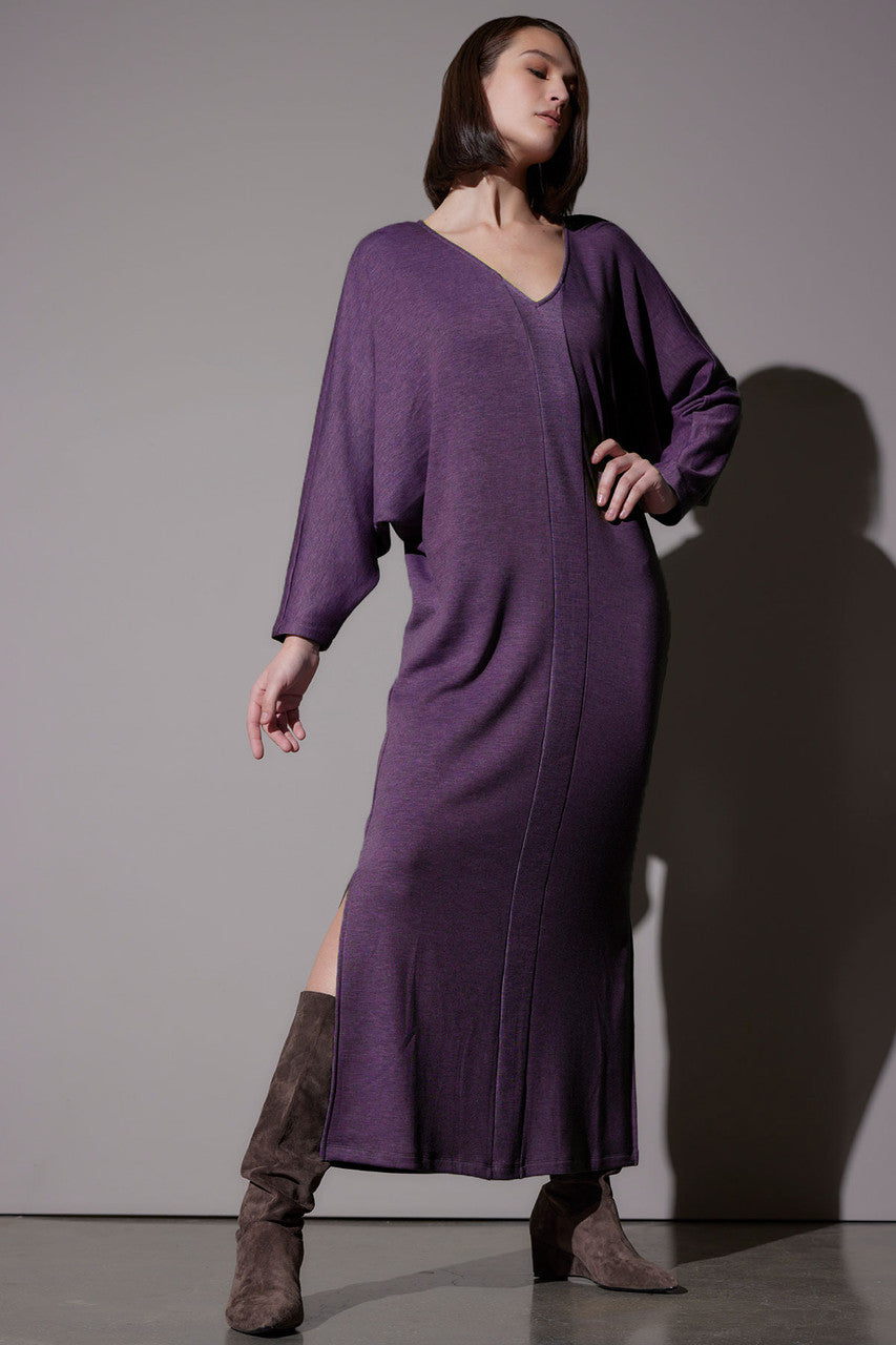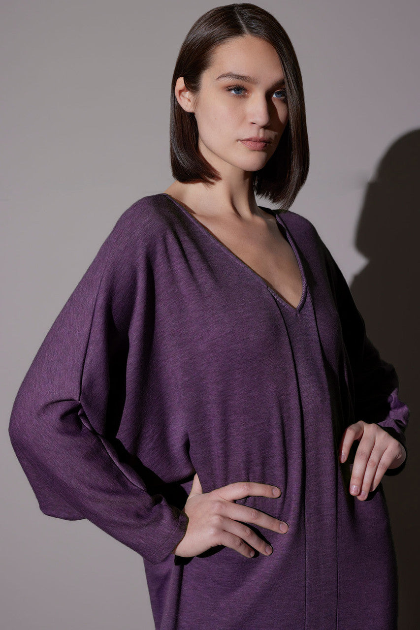 - Relaxed and comfortable wedge shape lounger with v shape neckline, side slits at bottom hem and inserted rib detailing at center front