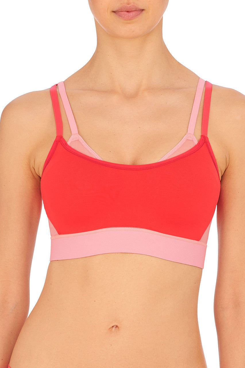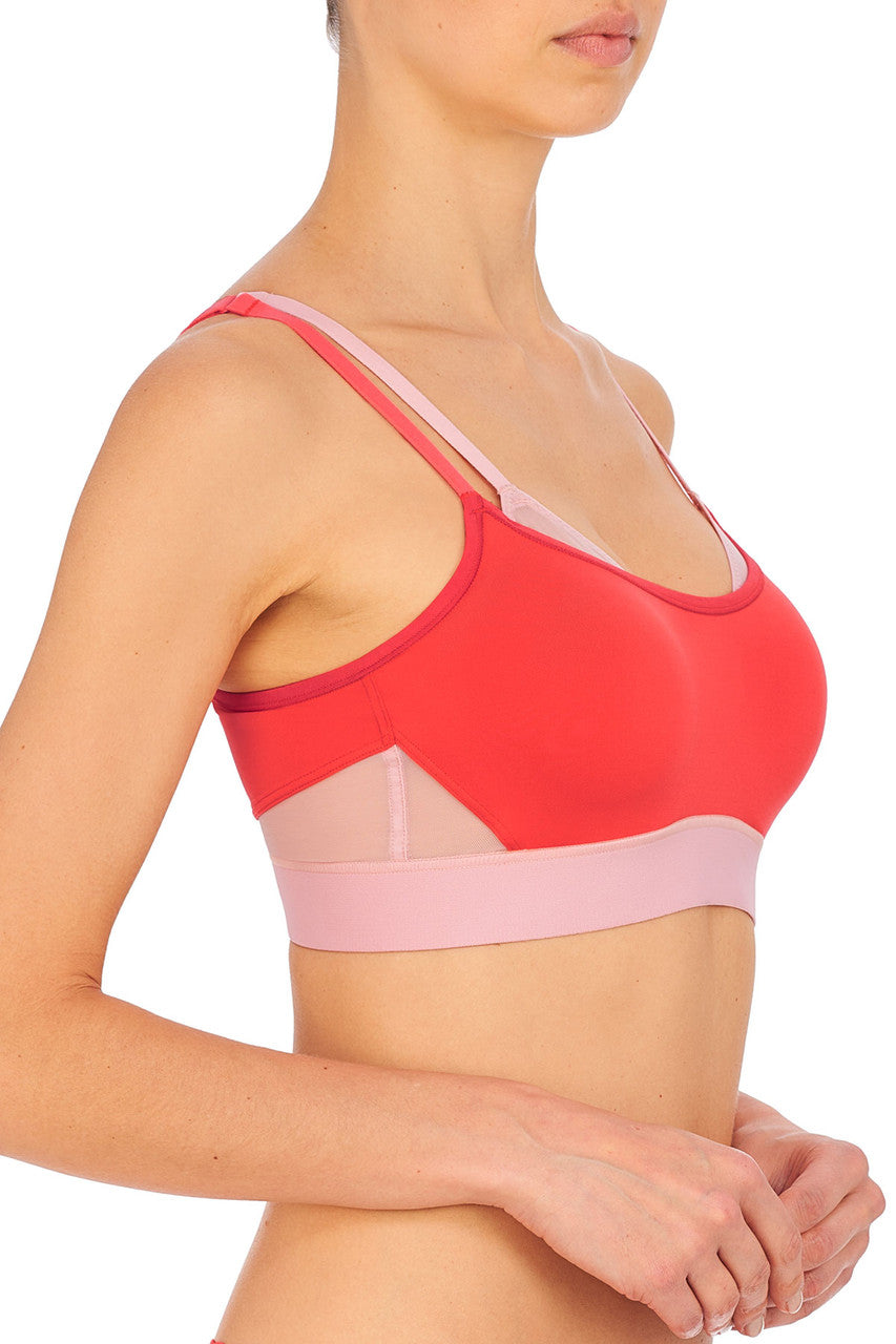 Get the look of layering without the bulk. A fashion forward, high impact, modern coverage sport bra designed to give the support of 2 bras in 1.