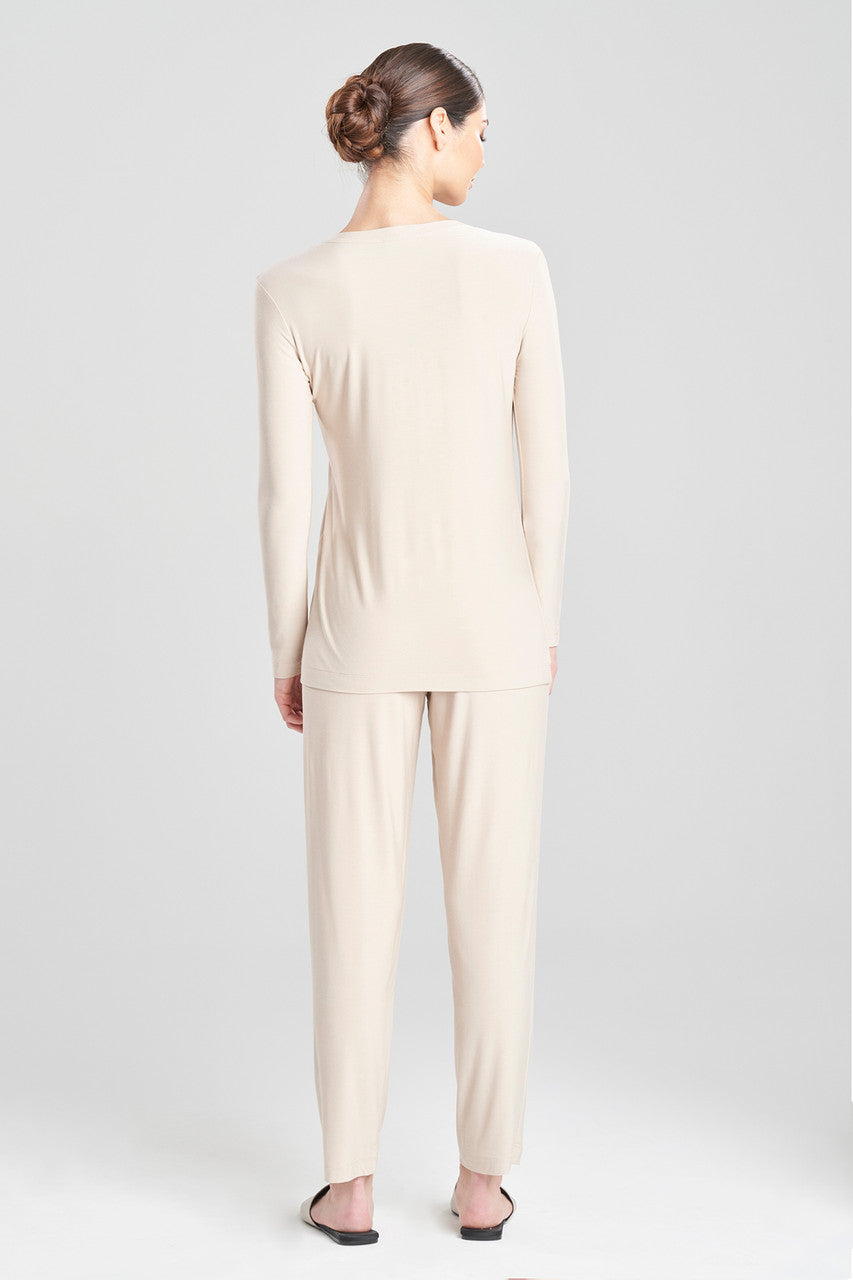 - Flattering button down V-neck PJ with luxe leopard pipping details paired with a straight leg pant with an elastic waistband and drawstring