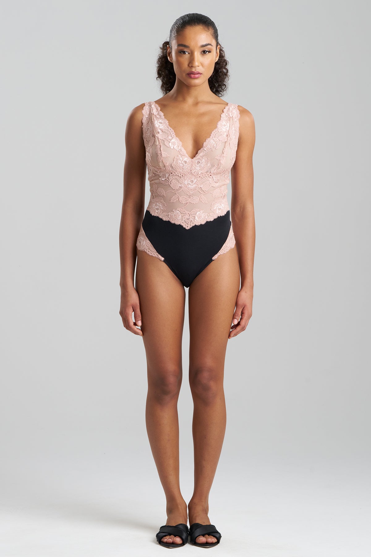 - Form-fitting garment crafted from a combination of delicate lace and soft jersey