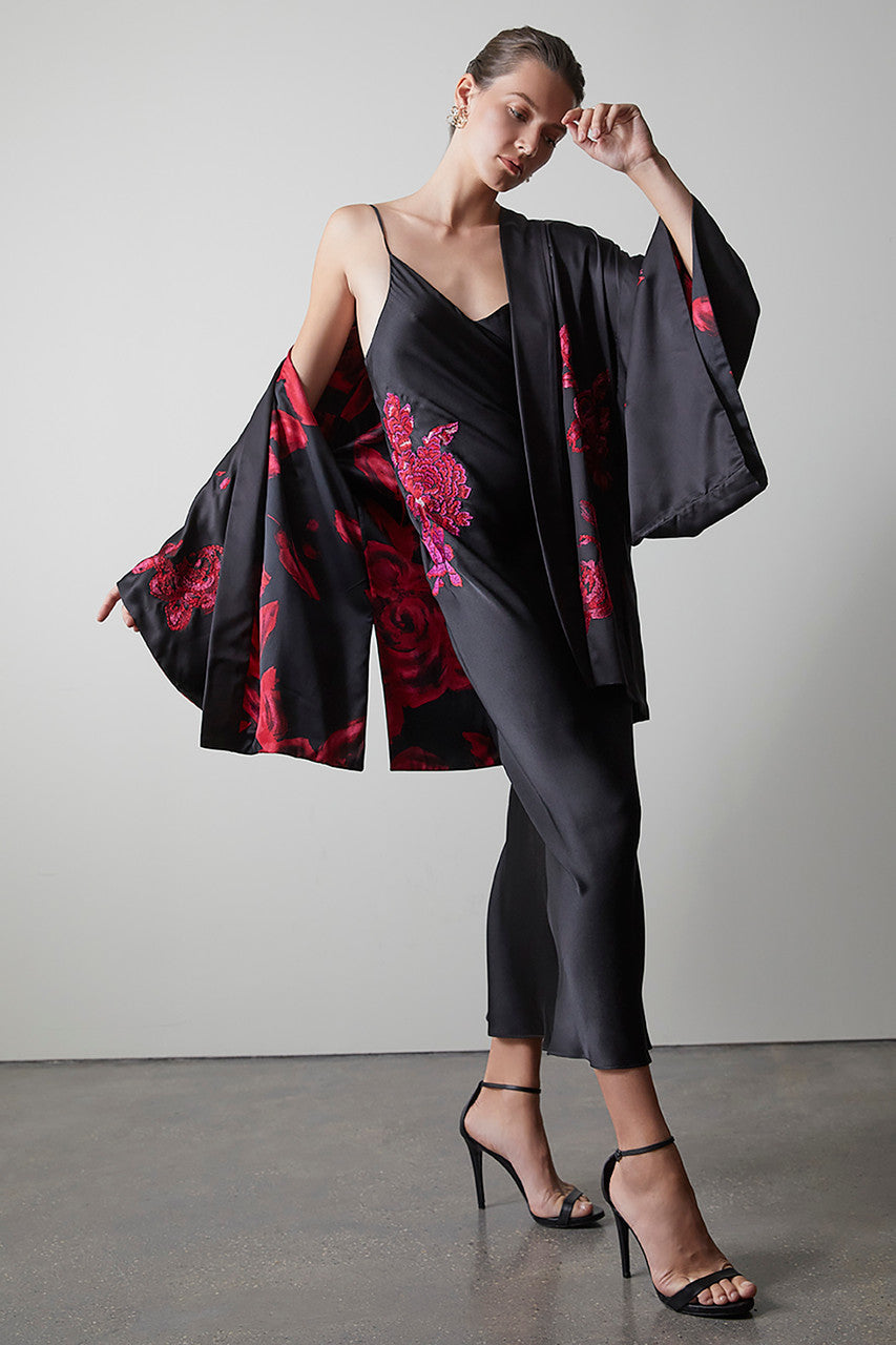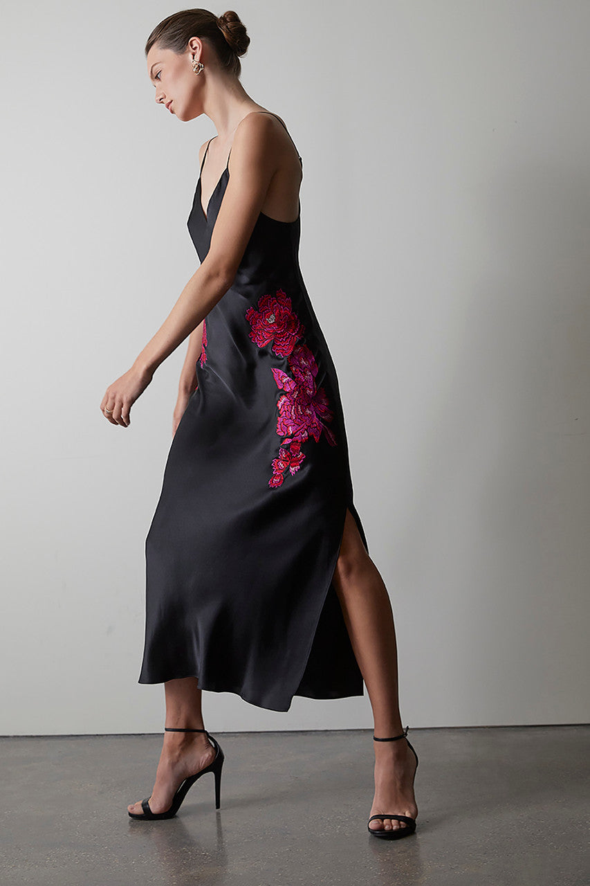 Bold, oversized romantic florals embroidered on silk charmeuse.