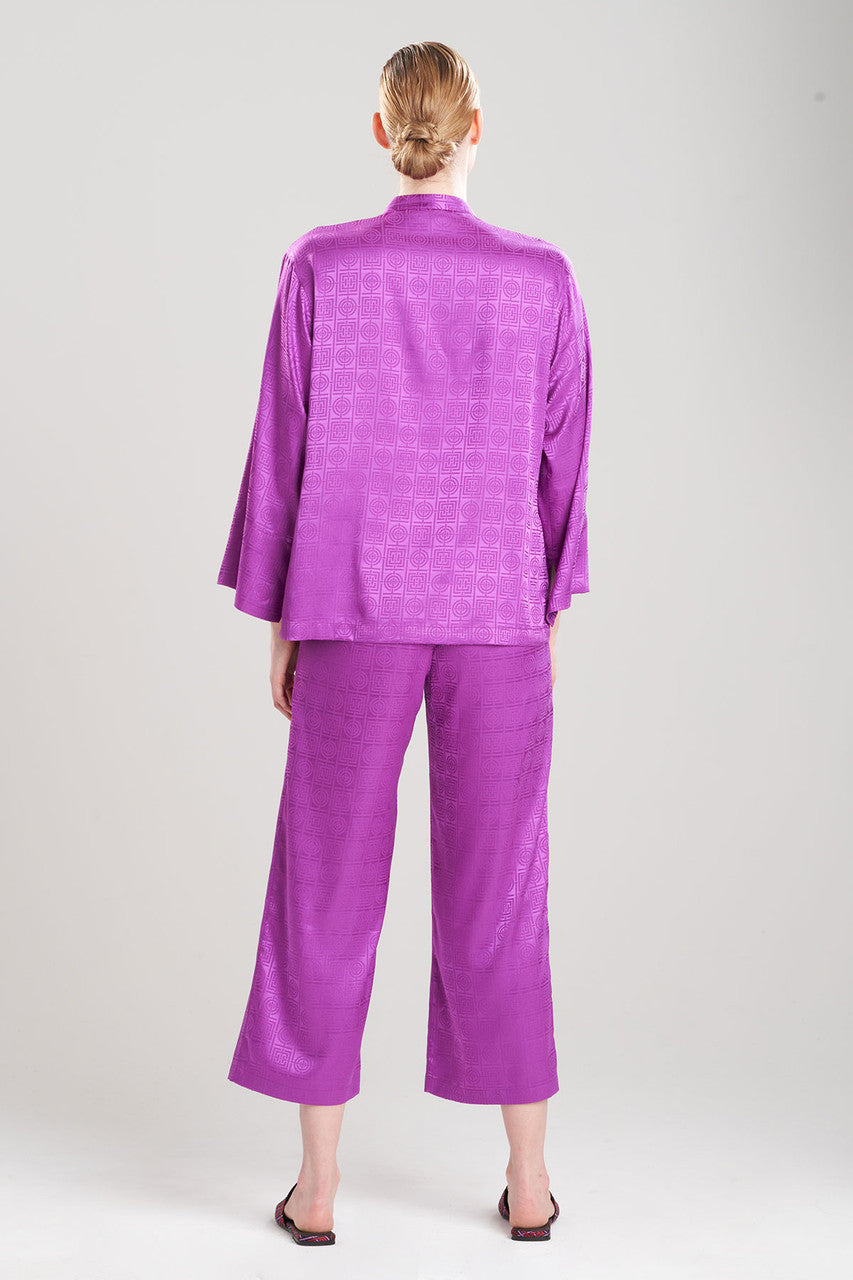• Relaxed and classic mandarin PJ with a mandarin collar and buttons at center front for closure, paired with a straight leg pant with an elastic waistband and drawstring