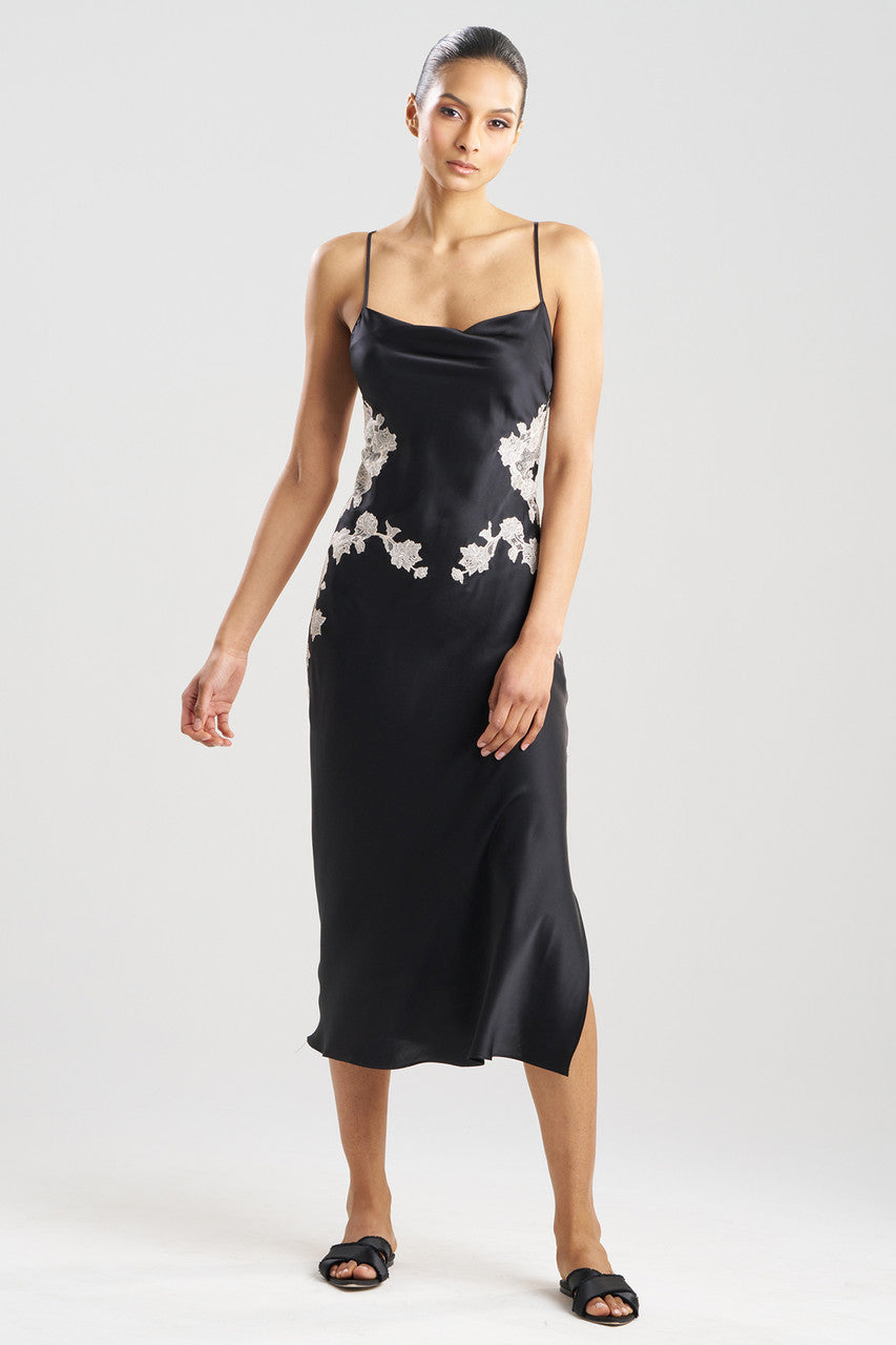 The iconic Lolita collection combines silk charmeuse and intricate Chantilly lace appliques.