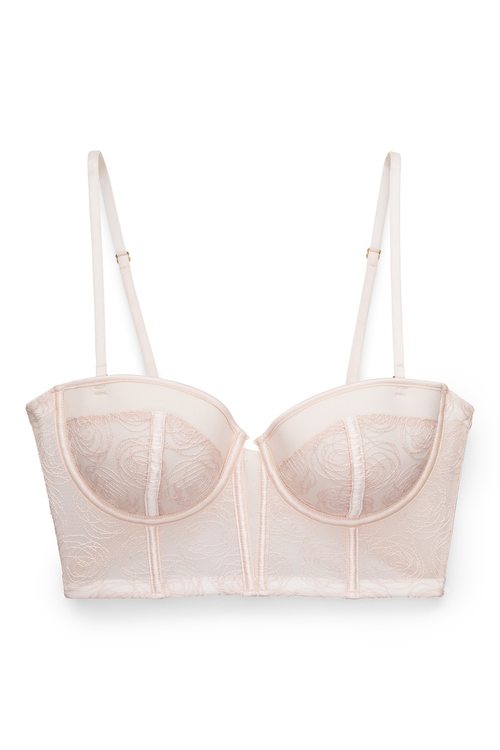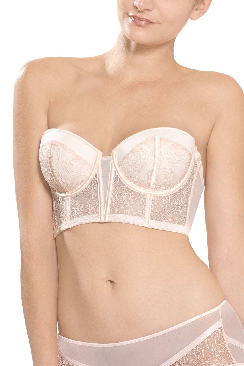 Wide embroidered tulle band adds to the sexy, sophisticated look of this intricate bustier bra