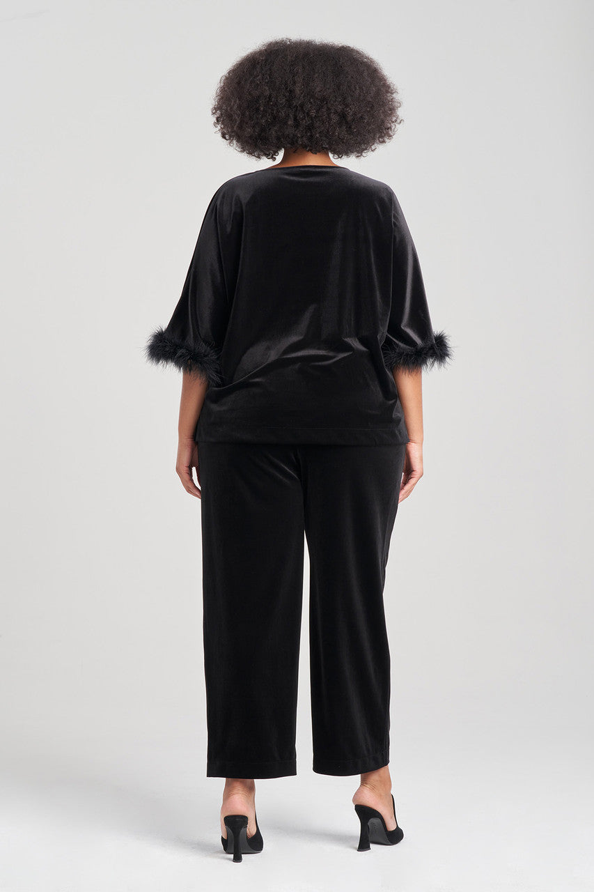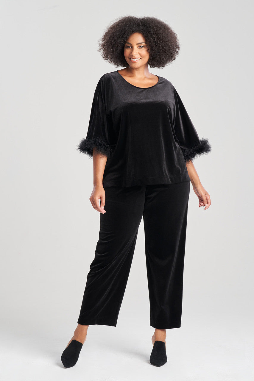 - Our relaxed and flowy pullover PJ with a straight leg pant with an elastic waistband and drawstring, comboed with luxury feathers on the sleeves