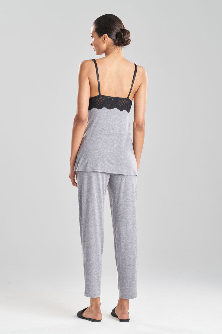 - Flattering tank PJ with applique lace on the cups and adjustable straps, paired with a straight let pant, elastic waistband and drawstring