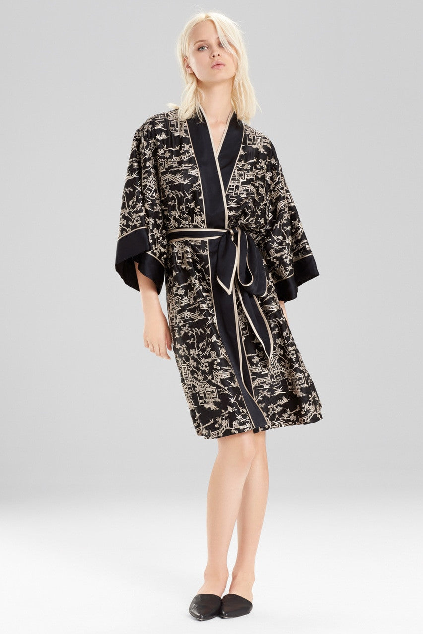 Where elegance meets comfort - you will adore this bold, all over embroidered Pagoda silk robe