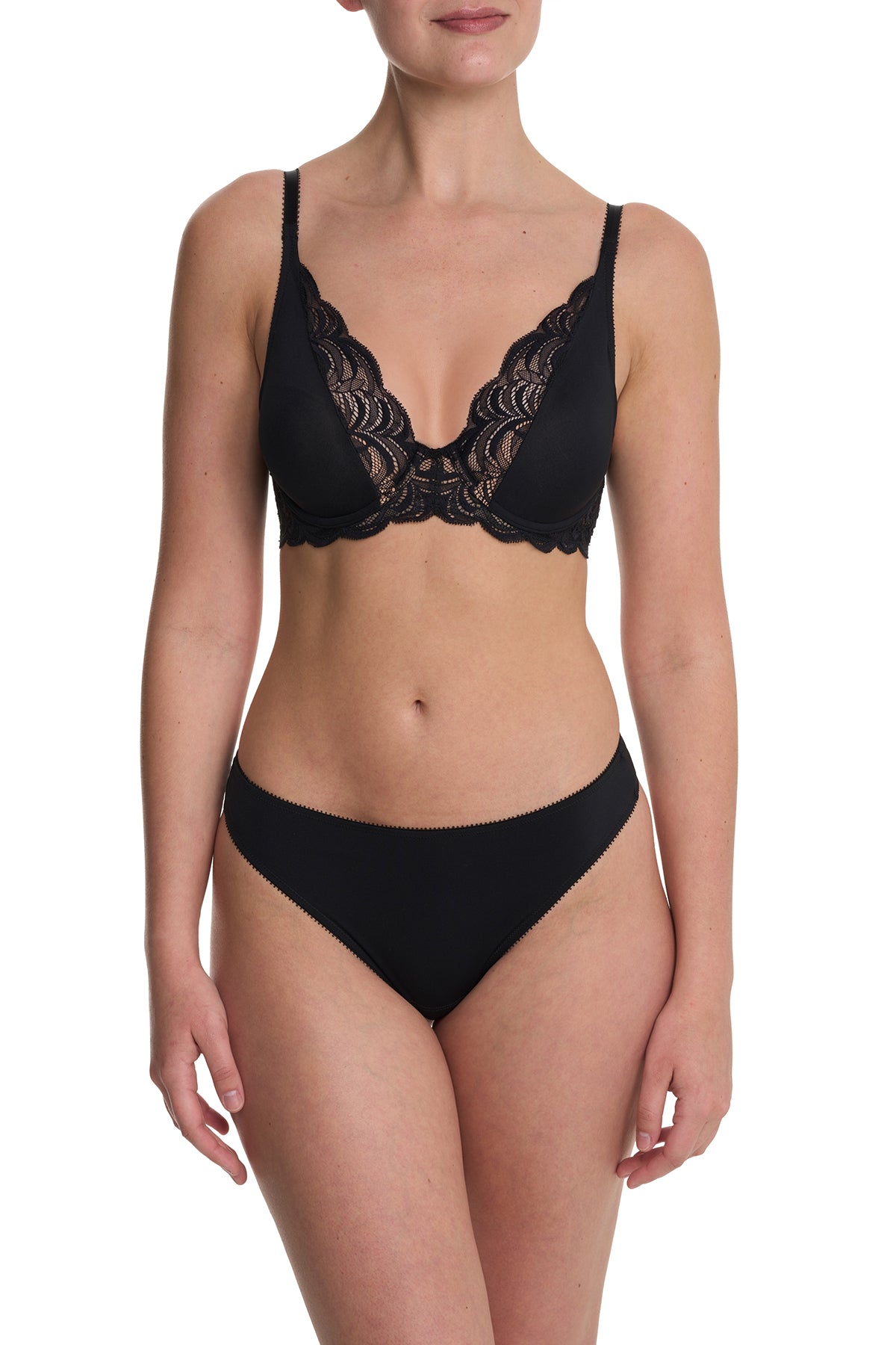 - Flattering deep plunge silhouette features stretch lace to give the look of a layered cami