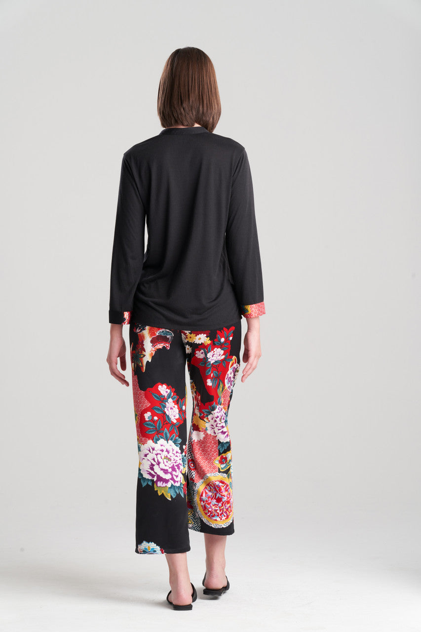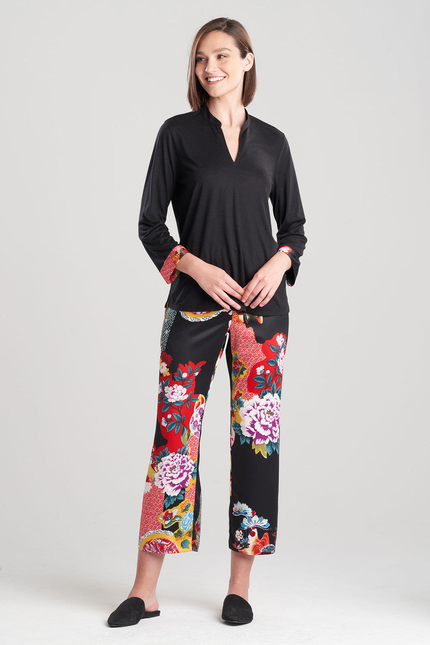 - Comfortable and airy pullover PJ with a mandarin collar comboed with our jersey Congo fabric for the top and printed cuffs, printed satin bottoms