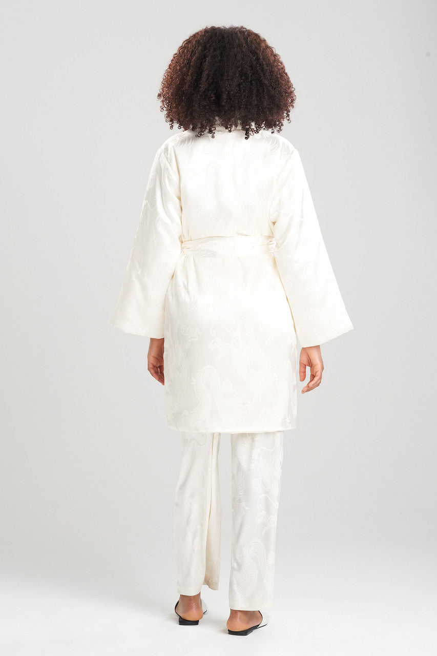- Relaxed and classic mandarin PJ with a mandarin collar and buttons at center front for closure, paired with a straight leg pant with an elastic waistband and drawstring