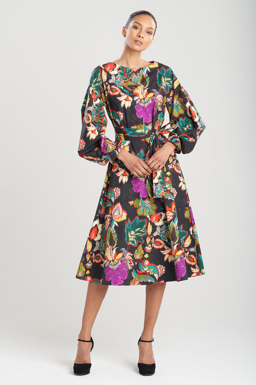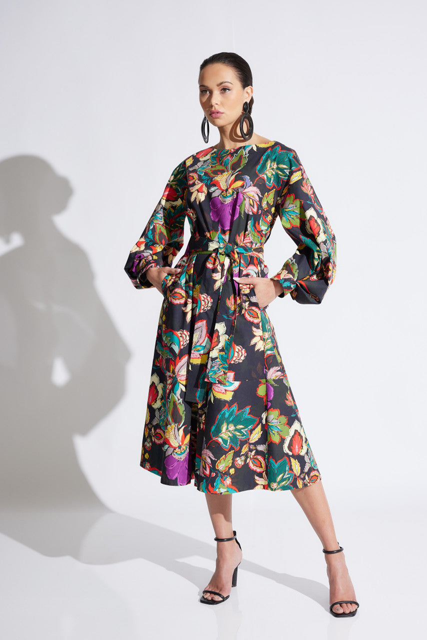 - A line, boat neck dress with a self tie belt and a full bodied skirt in our incredible multicolored floral Sayuri print