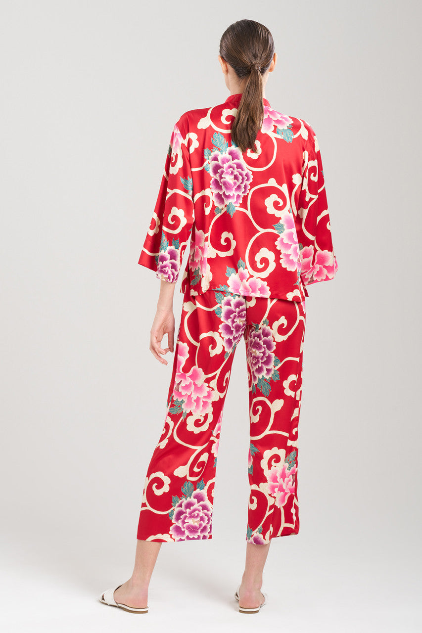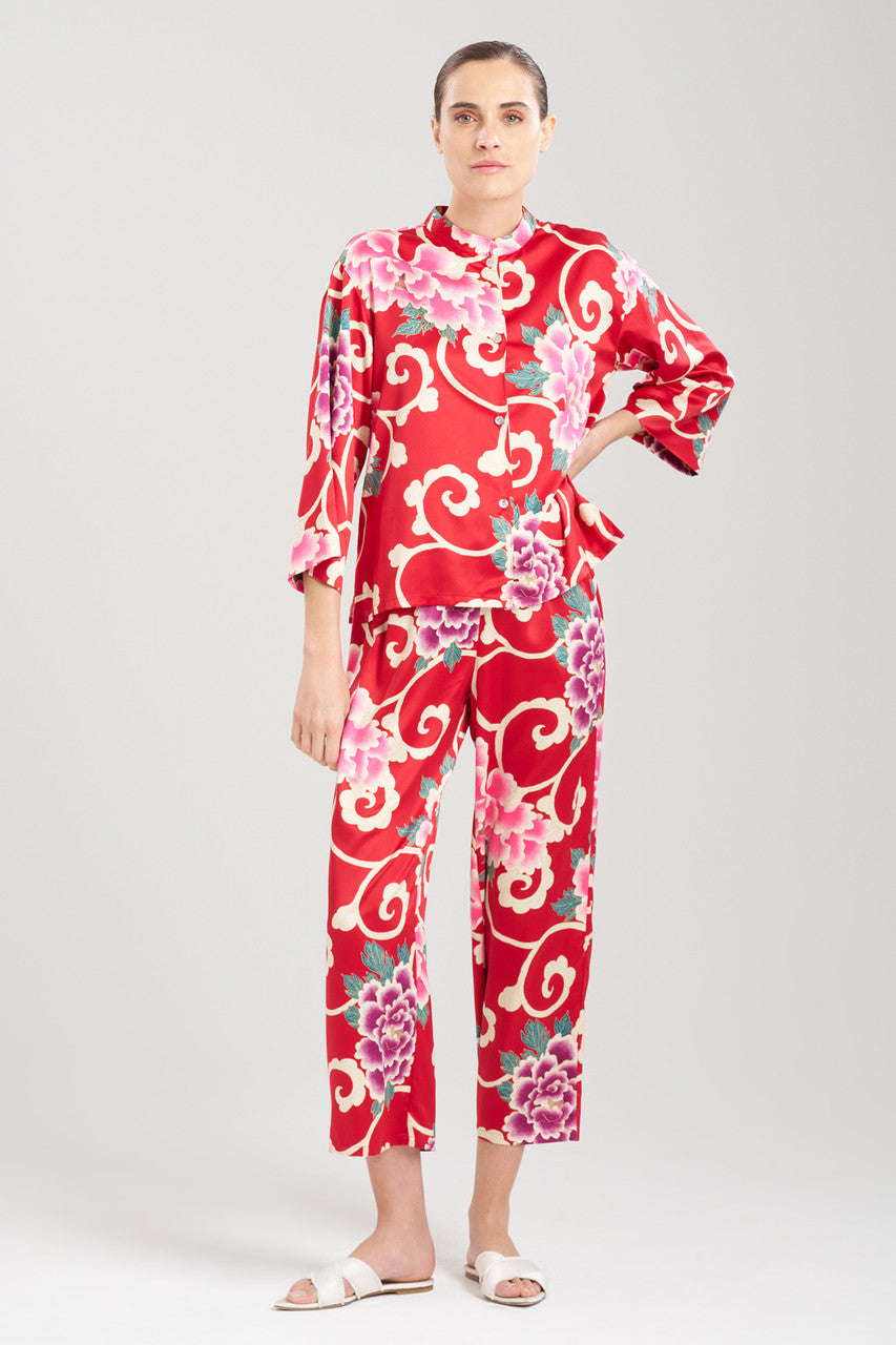 Stand out while staying in. Festive scrolls and bold florals lay beautifully on stretch satin.