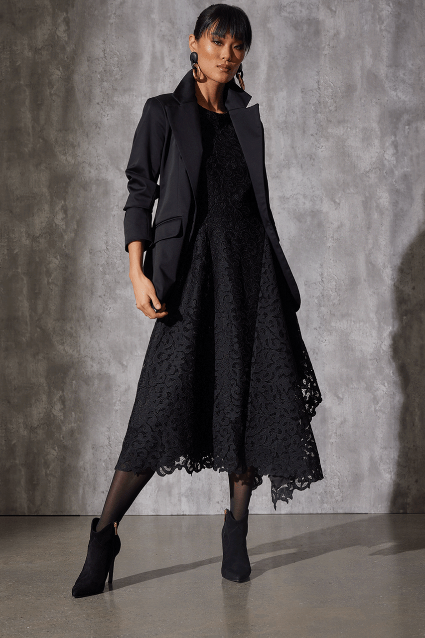 Details & Care For Scroll Lace Asymmetric Belted Dress