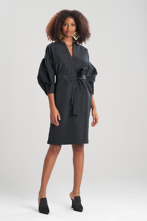 Crisp and lustrous fabric from Italy. A lightweight balloon sleeve shirtdress that holds it's shape.