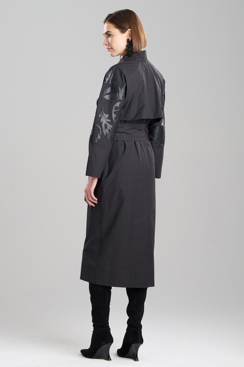 An update to your classic trench coat with soft faux leather embroidery paired with crisp taffeta.