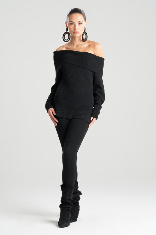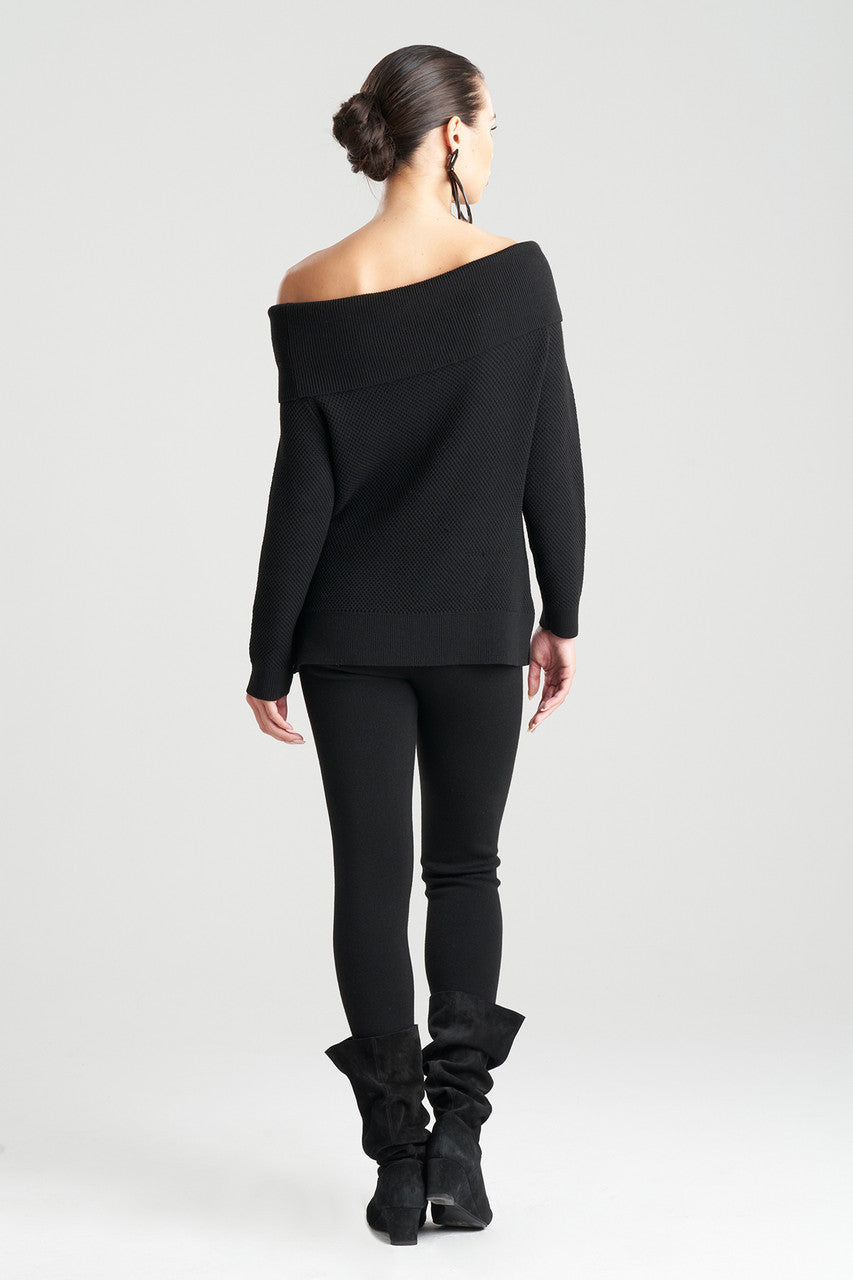 - Long sleeve textured sweater knit with off the shoulder detailing
