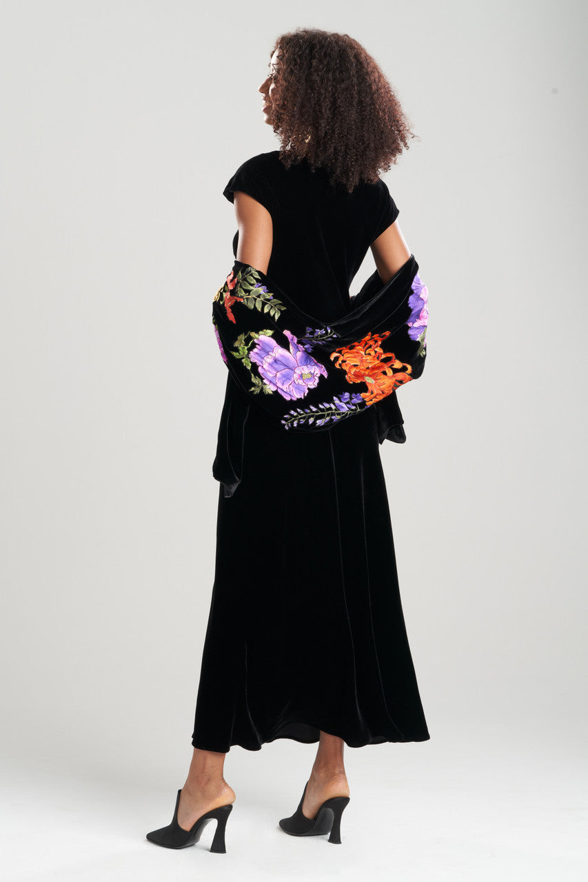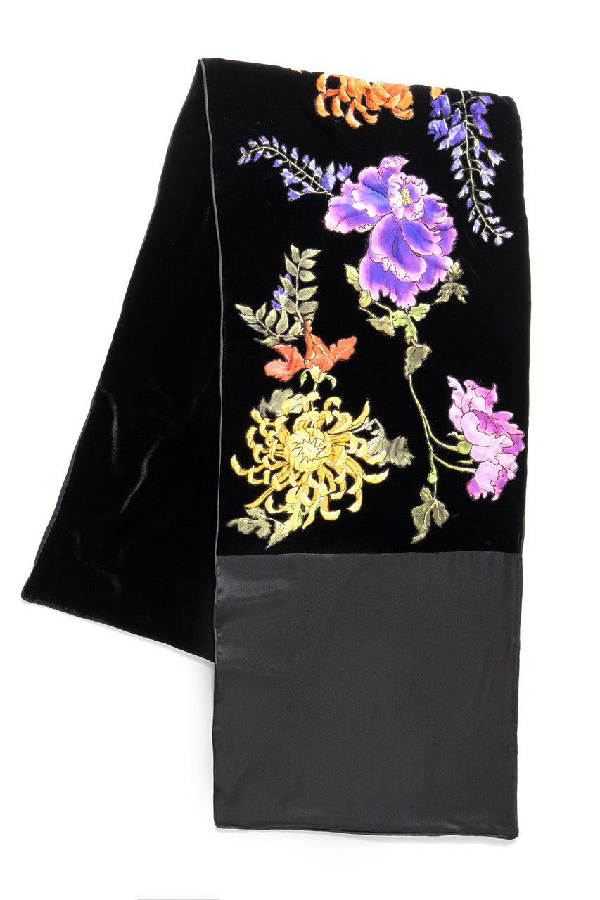 • Phenomenal double sided scarf with luxurious silk charmeuse and plush velvet fabrics with our Sumida print applique