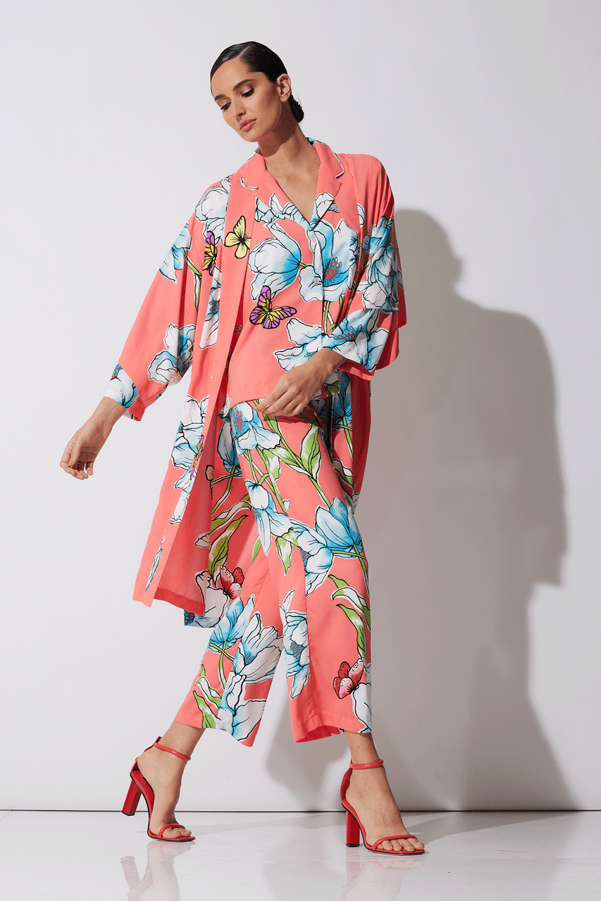Slip into the dramatic floral and butterfly printed charmeuse.