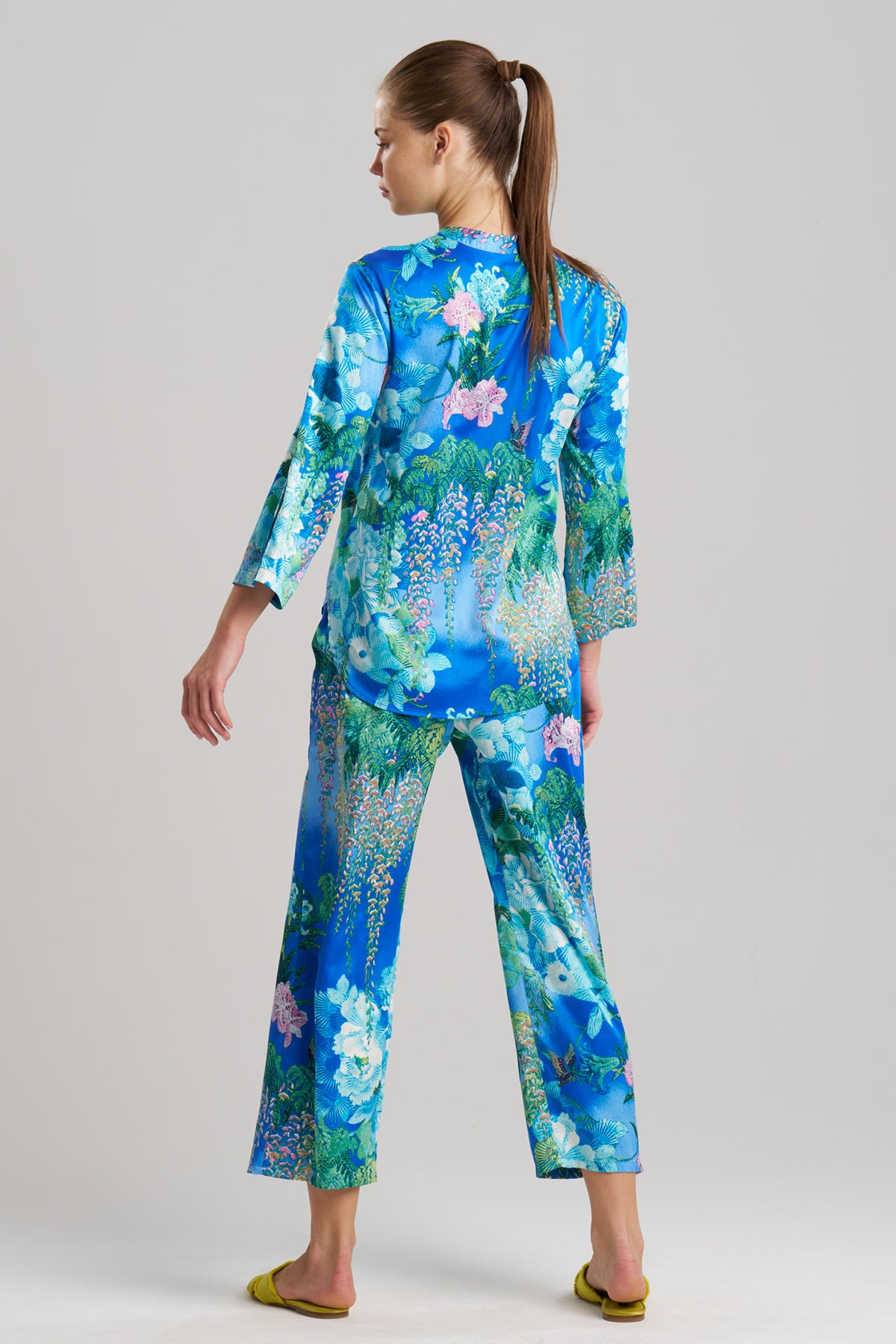 Relax in the serenity of Wisteria Garden. A printed stretch satin that moves with you.