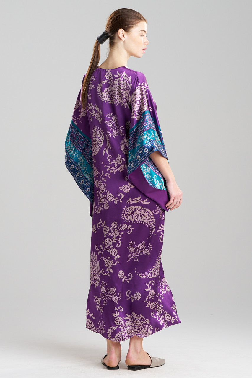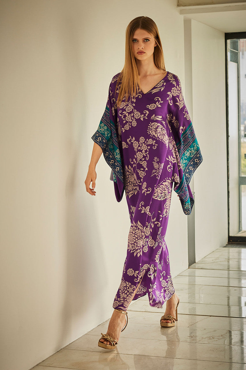 Feel regal in exuberant purple with turquoise trim. A harmony of intricate paisleys and luxe silk.